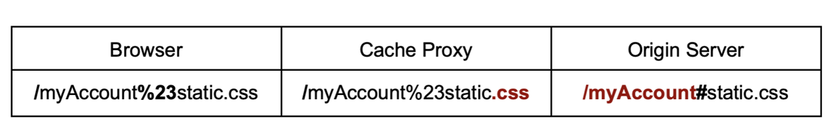 "/myAccount%3Fparam" → "/myAccount?param"There are also many other encodings supported by different cache proxies. Even though most of them are not used by default, it is possible to configure CDNs like CloudFlare or CloudFront to apply custom transformations and decode the path for caching or access control purposes.